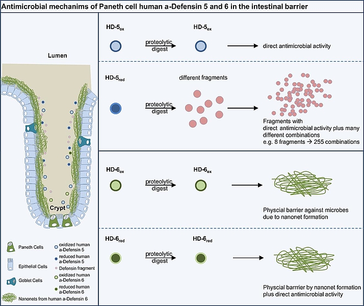 Es werden verschiedene Möglichkeiten antimikrobieller Abwehrmechanismen von Paneth-Zell Defensinen gezeigt. Während HD-5ox eine direkte antimikrobielle Wirkung zeigt, wird HD-5red von Proteasen in verschiedene, antimikrobiell aktive Fragmente gespalten. Im Gegensatz zu HD-5, ist weder HD-6ox noch HD-6red anfällig für den Verdau durch Proteasen weil dieses Defensin in der Lage ist Nanonetz-Strukturen zum Einfangen von Bakterien zu bilden. Nur HD-6red zeigt nach Veränderung der Struktur zusätzlich eine antimikrobielle Wirkung. Die verschiedenen Mechanismen sind eng miteinander verknüpft und schützen so unsere Oberfläche und regulieren die Mikrobiomzusammensetzung, was hier schematisch verdeutlicht wird.